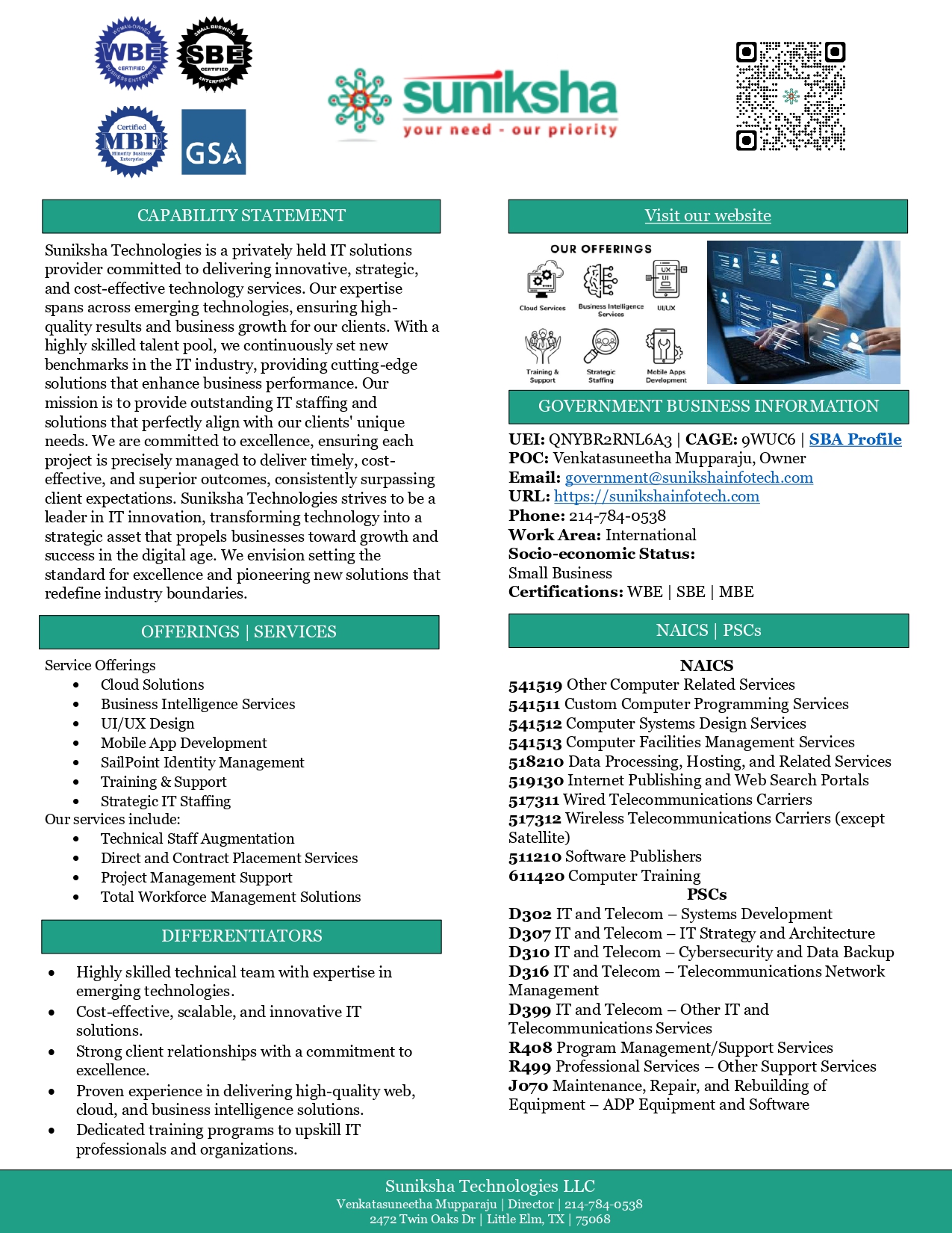 Suniksha Technologies is a privately held IT solutions provider committed to delivering innovative, strategic, and cost-effective technology services. Our expertise spans across emerging technologies, ensuring highquality results and business growth for our clients. With a highly skilled talent pool, we continuously set new benchmarks in the IT industry, providing cutting-edge solutions that enhance business performance. Our mission is to provide outstanding IT staffing and solutions that perfectly align with our clients' unique needs. We are committed to excellence, ensuring each project is precisely managed to deliver timely, costeffective, and superior outcomes, consistently surpassing client expectations. Suniksha Technologies strives to be a leader in IT innovation, transforming technology into a strategic asset that propels businesses toward growth and success in the digital age. We envision setting the standard for excellence